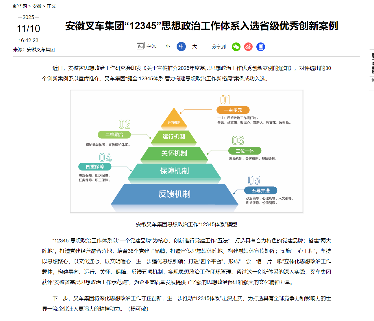 近日,安徽省思想政治工作研究會印發《關于宣傳推介2025年度基層思想政治工作優秀創新案例的通知》,對評選出的30個創新案例予以宣傳推介。叉車集團“健全‘12345體系’著力構建思想政治工作新格局”案例成功入選。 “12345”思想政治工作體系以“一個黨建...